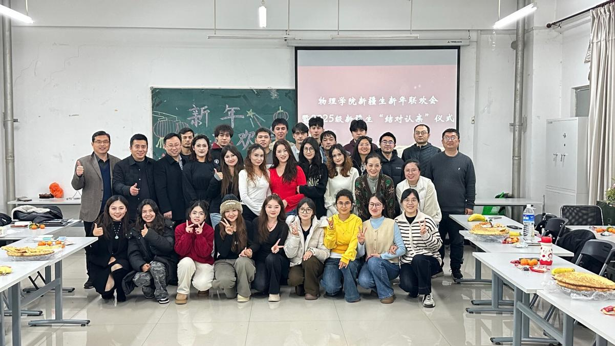 12月29日下午,物理学院举办新疆籍少数民族学生迎元旦联谊会,学院领导班子、学工队伍、结对帮扶教师代表与全体新疆籍少数民族学生欢聚一堂,共迎元旦。联谊会氛围热烈温馨,学工队伍特意准备了新疆特色馕饼、水果等小吃美食,让22名新疆籍学子在异乡感受到家的温暖。学院党委书记李辉在致辞中表示,学院将持续铸牢中华民族共同体意识,全力为新疆籍学生营造温暖的成长环境,推动各民族同学交往交流交融、共同进步,并向同学们送上新年祝福。活动中,2025级新疆新生分享了入学以来的成长感悟,学院领导班子作为2025级新疆生的结对帮扶教师认真倾听学子心声,细致了解他们的学习生活情况,传递学院的关怀与支持。随后的文艺互动环节,新疆籍同学合唱《这里是新疆》,浓郁的地域风情感染全场,师生们自发载歌载舞,用歌声传递祝福,用舞蹈抒发喜悦,定格下各民族亲如一家的温馨画面。此次活动不仅是辞旧迎新的欢聚,更是物理学院“三全育人”理念的生动实践,体现了学院团结包容的文化底蕴。新的一年,学院将继续凝聚师生力量,高度重视民族团结工作,通过学业帮扶、生活关怀等多项举措,为新疆籍学生成长保驾护航。