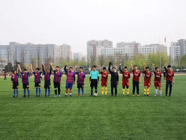 绿茵杯4月4日下午进行对阵的双方分别是身穿暗红色球衣的繁星一队与身穿红蓝球衣的CXK队。