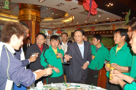 匡镜明校长在举杯预祝北京理工大学清研利华足球队旗开得胜、马到成功!