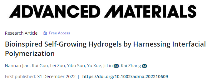 论文详情:Nannan Jian, Rui Guo, Lei Zuo, Yibo Sun, Yu Xue, Ji Liu*, Kai Zhang*, Bioinspired Self-Growing Hydrogels by Harnessing Interfacial Polymerization. Advanced Materials, 2022: 2210609.