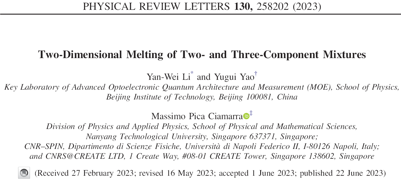 近日,北京理工大学物理学院李艳伟研究员、姚裕贵教授同新加坡南洋理工大学数学物理学院Massimo Pica Ciamarra教授合作,在二维熔化研究中取得重要进展,相关结果发表在物理学顶尖期刊Physical Review Letters上。