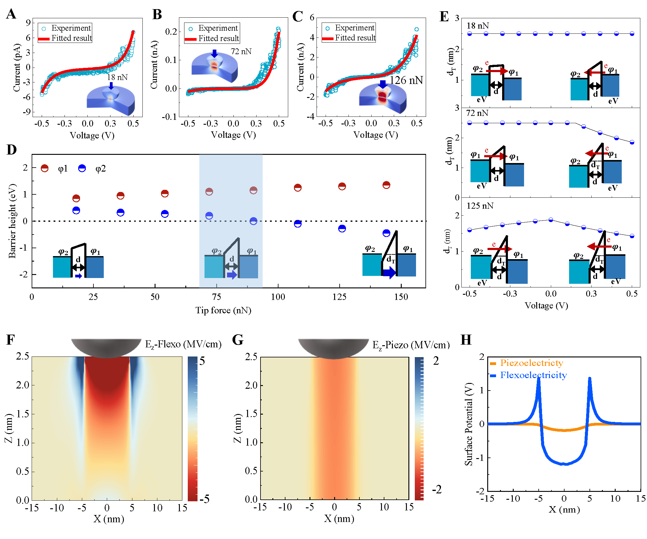 图3. 针尖力增强CIPS电流整流效应的定量分析。(A至C) 不同针尖力下典型的I-V曲线及使用梯形和三角形隧穿势垒模型进行拟合的结果。(D) 不同针尖力下上下界面隧穿势垒的变化。插图为隧穿势垒的示意图。φ1和φ2分别表示Pt/Ir针尖-样品界面和样品-Au衬底界面的隧穿势垒。(E) 针尖力为18、72和125 nN时隧穿厚度 d T的变化。插图为势垒变化的示意图。(F和G) 分别为针尖力为144 nN时计算得到的压电场和挠曲电场(Ez-piezo和Ez-flexo)。(H) 根据压电/挠曲电场计算得到的针尖-样品接触处的表面电势。
