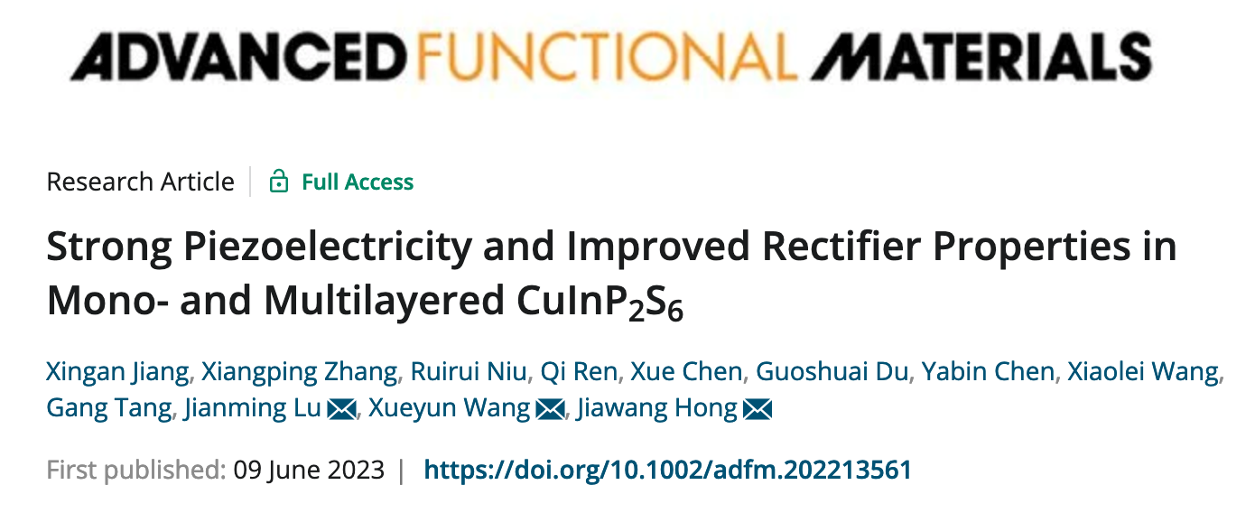 近日,北京理工大学宇航学院洪家旺教授、王学云副教授团队报道了单原子层厚度的二维范德瓦尔斯CuInP2S6铁电材料面外强压电性效应以及增强的电流自整流特性,相关成果以“Strong Piezoelectricity and Improved Rectifier Properties in Mono- and Multilayered CuInP2S6”为题,发表于国际顶级学术期刊《Advanced Functional Materials》。