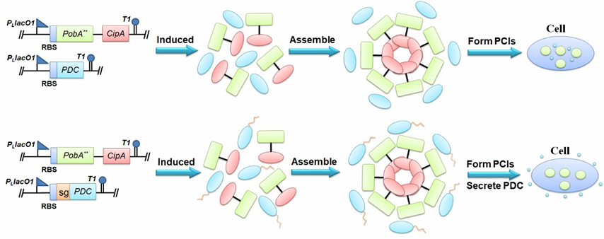 邻苯三酚是一种具有多种生理功能和药物价值的酚类化合物。申请人在大肠杆菌中成功构建了以葡萄糖为初始碳源的邻苯三酚非天然生物合成途径。在生物合成过程中,关键前体物4-羟基苯甲酸先被Y385F/T294A PobA催化生成3,4-二羟基苯甲酸,3,4-二羟基苯甲酸再被Y385F/T294A PobA进一步催化生成没食子酸,随后脱羧酶PDC对没食子酸进行脱羧反应生成邻苯三酚。脱羧酶PDC的底物多样性导致其也会对中间产物3,4-二羟基苯甲酸进行脱羧反应,进而生成副产物儿茶酚。在组装完整途径并转化到宿主菌中发酵后发现邻苯三酚产量很低,副产物儿茶酚产量很高,说明Y385F/T294A PobA催化3,4-二羟基苯甲酸到没食子酸的过程不够迅速,导致大量的碳源流向了副产物儿茶酚的生产途径。于是,申请人借鉴了CipA的自组装特性,将CipA与合成途径中的关键限速酶Y385F/T294A PobA融合形成融合蛋白(Y385F/T294A PobA-CipA或CipA-Y385F/T294A PobA),随后融合蛋白在胞内聚集形成包涵体(图3)。聚集后的Y385F/T294A PobA加快了4-羟基苯甲酸到没食子酸的两步转化,降低了脱羧酶PDC对3,4-二羟基苯甲酸的催化,提高了目标产物邻苯三酚的产量。相关研究成果发表在 Applied Microbiology and Biotechnology (影响因子:5.0002)杂志上(CipA-mediating enzyme self-assembly to enhance the biosynthesis of pyrogallol in  Escherichia  coli .)。陈振娅副研究员为通讯作者。