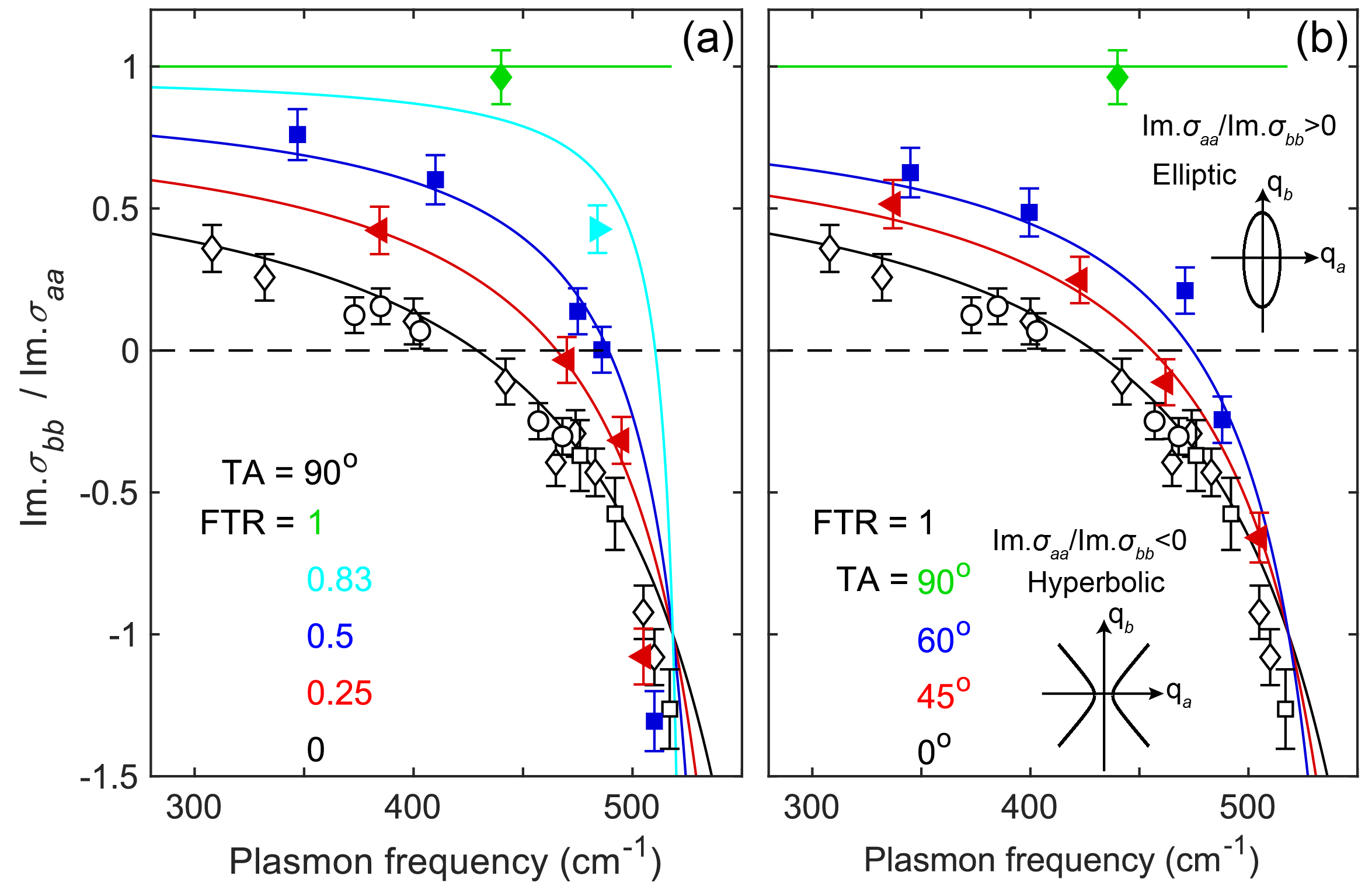 针对以上问题,研究人员选择最近发现的天然双曲等离激元材料WTe2作为研究对象,并制作了双层转角结构。通过改变旋转角度(Twist Angle)和薄膜厚度比(Thickness Ratio),研究人员详细研究了双层结构中天然双曲区间频率的变化。研究团队分析了非图案化薄膜的消光光谱,并对斜带状阵列中等离子体极化激元强度的偏振依赖性进行了细致研究。两种探测方法均表明,通过改变薄膜厚度比和双层旋转角,可以实现极化激元拓扑性从双曲区间向椭圆区间的转变。研究表明,这种调控的关键在于双曲薄膜整体表现的表面光学导电率,可以通过将两个薄膜的光学导电率值相加得到。这种方法为所观察到的膜厚比和扭转角度可调拓扑转变提供了明确且一致的解释。
