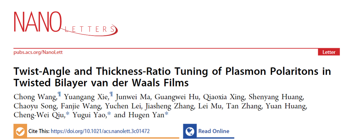 日前,北京理工大学物理学院姚裕贵教授、王冲特别研究员,以及复旦大学物理系的晏湖根教授和新加坡国立大学的仇成伟教授合作,共同揭示了操控双层薄膜中的极化激元的光学拓扑性的新机制。相关研究题目为《扭转角度和膜厚比调控双层范德瓦尔兹薄膜中的极化激元》(Twist-Angle and Thickness-Ratio Tuning of Plasmon Polaritons in Twisted Bilayer van der Waals Films),成果被发表在《纳米快报》(Nano Letters)上。