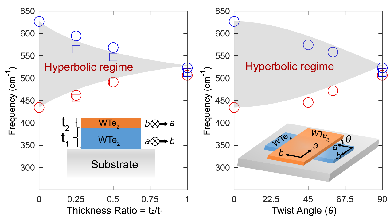 构造二维材料双层转角结构为调控天然双曲极化激元提供了一种重要方法。通过改变两层各向异性二维材料之间的转角,可以实现从双曲到椭圆拓扑性的调控。然而,一方面,双层转角结构中极化激元拓扑性的调控机理还需进一步研究;另一方面,该结构中另一个重要的自由度——“两层材料的厚度比”,对极化激元拓扑性的调控能力仍然不清楚。
