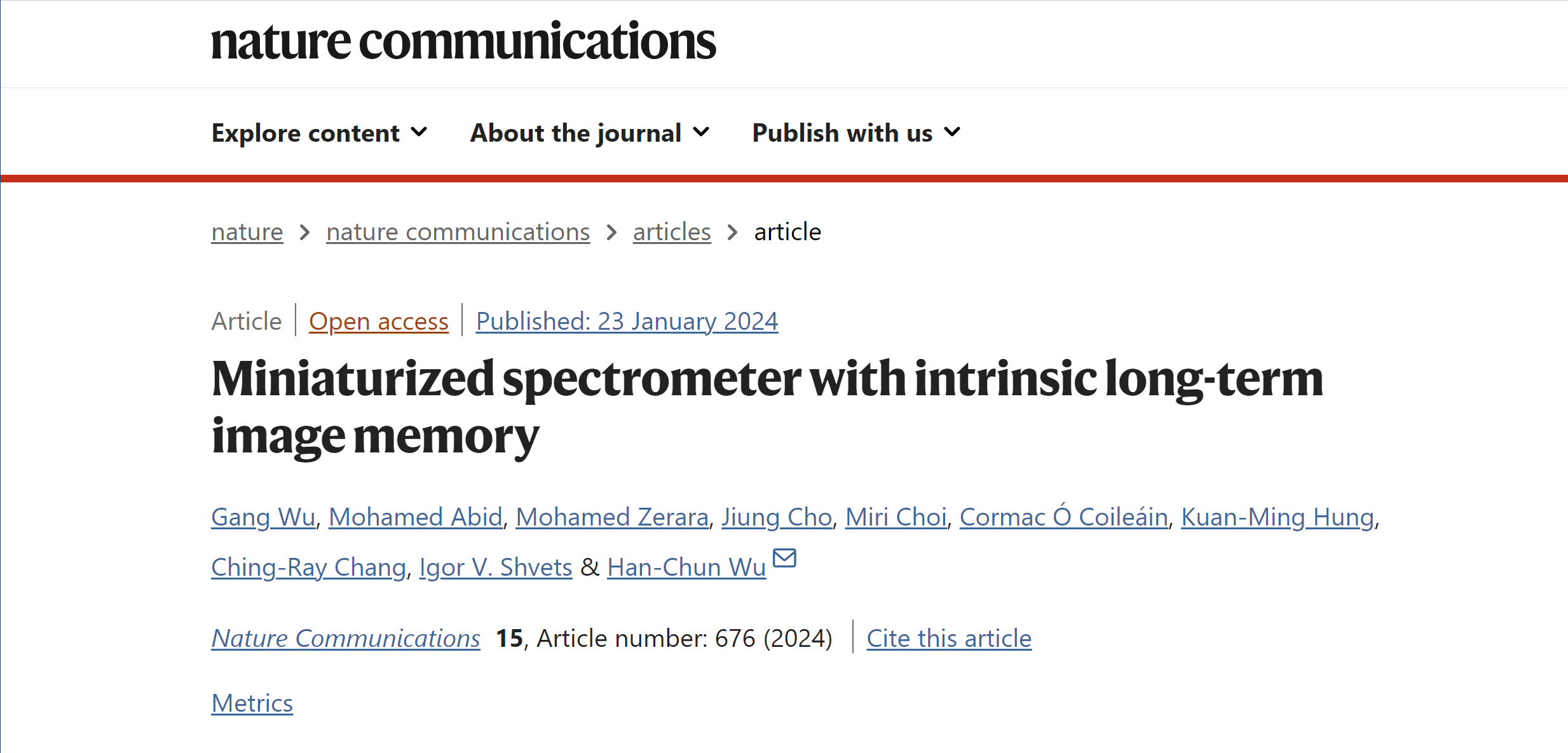 文章信息(*为通讯作者):Gang Wu, Mohamed Abid, Mohamed Zerara, Jiung Cho, Miri Choi, Cormac Ó Coileáin, Kuan-Ming Hung, Ching-Ray Chang, Igor V. Shvets and Han-Chun Wu*,“Miniaturized spectrometer with intrinsic long-term image memory”, Nature Communications 15, 676 (2024).