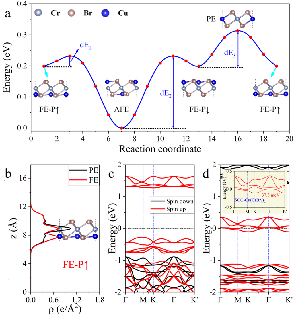 长期以来,人们一直在寻找具有本征多铁性的二维材料,以实现纳米电子器件中磁电耦合的应用。本工作中作者利用过渡金属原子修饰单层三卤化铬实现了单层稳定的Ⅰ型多铁性,并且其电极化为面外铁电极化,这有利于外场对其铁电性的调控。面外铁电极化表现出较强的原子选择性,作者发现了84种基于过渡金属的单层多铁材料,其中有12种具有面外铁电或反铁电极化。通过群论分析揭示了这种现象依赖于p-d耦合和晶体场劈裂。Cu修饰增强了三卤化物的本征铁磁性,并且提高了铁磁转变温度。通过计算不同铁电结构(反铁电和铁电)的电极化,作者研究了该系统中的磁电耦合效应。在这些体系中作者获得了铁电相和反铁电相,为磁性材料的外场调控、能量存储和转换应用提供了新机遇。此外,作者利用非平衡格林函数方法,计算了双电极Cu(CrBr3)2器件的输运性质,结果表明,Cu(CrBr3)2器件具有出色的自旋过滤特性和低偏压负微分电阻(Negative differential resistance, NDR)效应,具有低功耗的开关响应特性。作者的研究不仅深化了对二维多铁性材料的认识,预测了多种具有面外铁电极化的新材料,并揭示了其铁电性和铁磁性增强机制,在纳米电子和自旋电子器件领域具有广阔的应用前景。