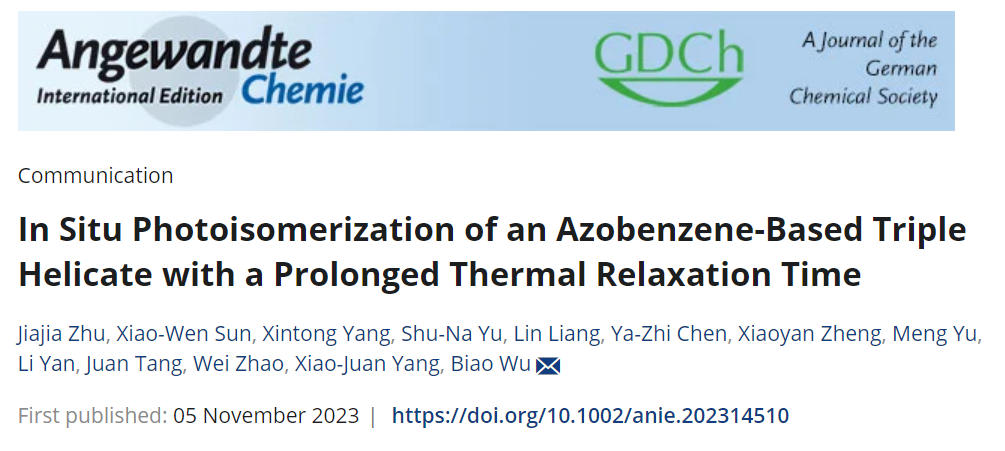近日,北京理工大学化学与化工学院吴彪教授和赵伟特别研究员在国际知名化学期刊《 Angewandte Chemie International Edition 》上发表题目为“In Situ Photoisomerization of an Azobenzene-Based Triple Helicate with a Prolonged Thermal Relaxation Time”的研究论文。该工作实验部分主要由北京理工大学研究生朱甲佳和孙小文完成,理论计算部分由研究生杨心彤在郑小燕长聘副教授的指导下完成。此项研究得到了国家自然科学基金,北京市自然科学基金和北京理工大学青年教师学术启动计划等项目的资助及北京理工大学分析测试中心的支持。