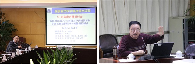 项目负责人北京理工大学赵之平教授对与会各位专家表示热烈欢迎,衷心感谢各位研究骨干这一年来对项目进展所作出的努力。赵之平教授分别从项目总体研究方案、本年度进展、存在问题及解决方案和下一步工作计划四个方面对2019年度工作情况做了总体汇报,并介绍了团队这一年来开展的主要工作以及取得的阶段性成果。清华大学李继定教授将荷叶疏水机理应用于渗透汽化膜,研究OPS、POSS、MOFs等添加剂对混合基质膜性能的影响以及MOFs对噻吩、正庚烷的吸附和扩散行为。李欢军副教授团队和黎汉生副教授团队硕士研究生分别以“基于超疏水表面构筑渗透汽化膜制备及性能研究”“嵌段共聚物分离膜制备及甲醛废水处理”“双膜法分离甲醛水溶液”为题介绍了各自团队这一年来的工作进展情况。