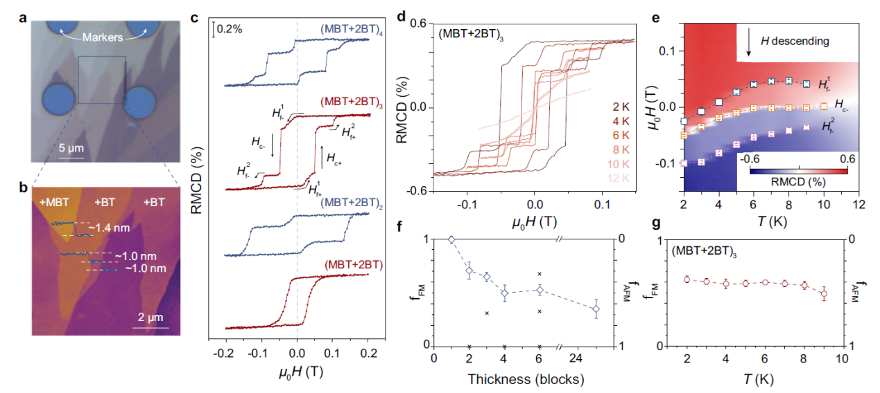 图1. a-b MnBi6Te10少层样品光学照片及表面形貌扫描;c少层MnBi6Te10 RMCD- μ 0 H 磁翻转曲线;d-e 3层MnBi6Te10磁翻转温度依赖;f-g铁磁-反铁磁占比随厚度及温度变化。