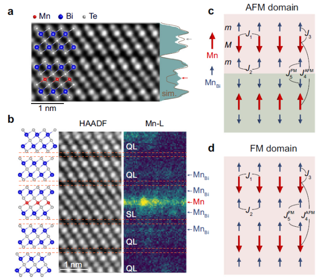 图2. a-b MnBi6Te10截面STEM及元素空间扫描;c-d MnBi6Te10(及MnBi4Te7)中铁磁与反铁磁基态结构。