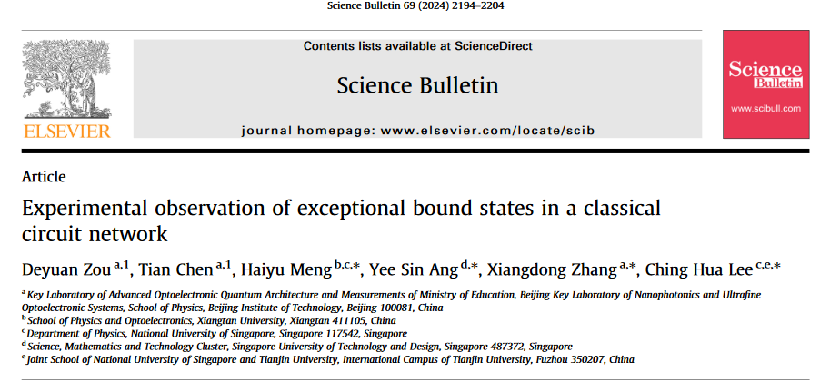 日前,北京理工大学物理学院张向东教授课题组和新加坡国立大学Ching Hua Lee等合作利用经典电路网络实现了奇异束缚态的实验观测。相关成果以“Experimental observation of exceptional bound states in a classical circuit network”为题发表在Science Bulletin期刊[Science Bulletin 69 (2024) 2194-2204]上。北京理工大学集成电路与电子学院博士后邹德源和物理学院陈天副教授为该论文共同第一作者,北京理工大学物理学院张向东教授、新加坡国立大学Ching Hua Lee、新加坡科技与设计大学Yee Sin Ang和湘潭大学孟海瑜为论文通讯作者。该研究工作得到了国家自然科学基金委的大力支持。