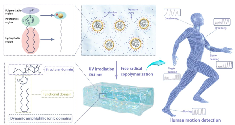 基于前期研究基础,团队进一步提出了“动态两亲离子域(DAID)”的设计策略,采用具有两亲性结构的可聚合IL单体,与丙烯酰胺单体共聚,合成了兼具高应变(1200-2390%)、强韧性(5-15 MJ -3)、优异电导率(0.13-0.2 mS cm-1)和高抗裂纹扩展能力的功能凝胶(图2)。在凝胶的三维聚合物网络中,ILs的结构域提高了聚合物的内聚强度;同时,ILs阳离子的长疏水烷基链作为物理交联点提供了良好的疏水结合以增强力学性能。因此,DAID的引入可使聚丙烯酰胺亲水链在大变形过程中逐渐展开。