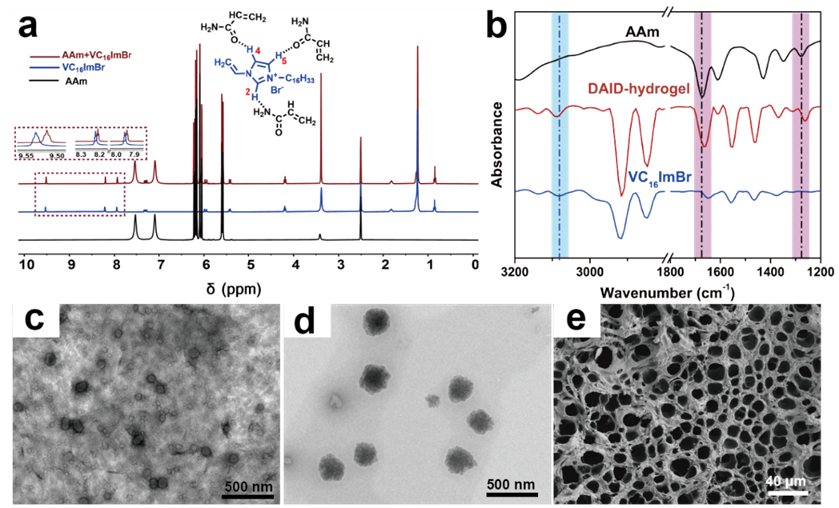1H核磁共振和傅里叶变换红外光谱(FT-IR)等手段表明不同单体间(即,丙烯酰胺与ILs)存在强相互作用(图3a和b)。当ILs浓度高于临界胶束浓度时,通过非共价相互作用可自组装形成胶束(图3c)。图3d进一步证实了丙烯酰胺和ILs胶束由于相互作用而发生聚集,从而形成了尺寸更大的混合单体体系。最终,DAID的引入使凝胶呈现出致密的网络结构(图3e)。