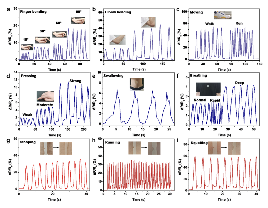 该凝胶为人体多方位健康监测提供了高灵敏的基础材料,其对人体的实时监测情况如图5所示。以呼吸监测为例,可将凝胶贴片置于胸腹部位(图5f),期间通过应变感应反馈信号以精确观察呼吸频率。不仅如此,凝胶贴片可根据需求贴于相关部位并进行运动实时监测,如大幅度的手指弯曲(图5a)、肘部弯曲(图5b)、跑步运动(图5c)等和小幅度的按压、吞咽和呼吸等(图5d-f)。此外,含有缺口的凝胶仍可灵敏检测弯腰、跑步和深蹲等运动而不断裂(图5g-i)。总之,DAID的设计策略为调控凝胶聚合物网络提供了指导,并为非接触医用设备的研发奠定了一定的材料基础。