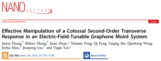Jinrui Zhong#, Shihao Zhang#, Junxi Duan*, Huimin Peng, Qi Feng, Yuqing Hu, Qinsheng Wang, Jinhai Mao*, Jianpeng Liu*, and Yugui Yao*,“Effective Manipulation of a Colossal Second-Order Transverse Response in an Electric-Field-Tunable Graphene Moiré System”,Nano Lett. 24, 5791−5798 (2024)  (#为共同一作,*为通讯作者)