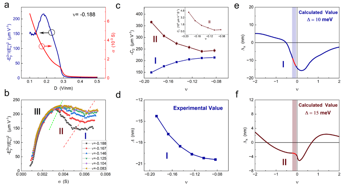 该研究工作有以下两个亮点:(1)实现了目前实验报道的最大的非线性霍尔输运信号,获得的二阶非线性霍尔电导比之前实验报导的最大值高出接近两个数量级,如图1所示;(2)通过改变层间偏置电场,在拓扑平带带边首次实现了调控两种主要机制对二阶非线性输运的贡献,观测到了由贝里曲率偶极子主导的向由螺散射主导的机制转变,如图2所示。这表明转角双层-双层石墨烯是富有潜力的研究二阶非线性输运的平台,对拓宽非线性输运和能带拓扑物性的研究有重大意义。