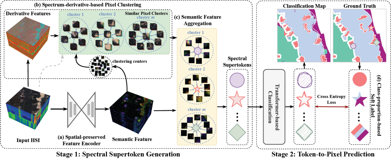 高光谱图像分类是一项将预定义类别分配给遥感场景高光谱图像中每个像素的任务,由于忽略了光谱相似像素之间的相关性,导致边缘定义不准确,难以管理相邻区域中的微小光谱变化。为此,科研团队提出了一种创新性的双阶段光谱超像素分类网络(DSTC)架构,具体如图1所示。引入了受超像素概念启发的新型双级光谱Supertoken分类器 (DSTC)。主要采用基于光谱导数的像素聚类,将具有相似光谱特征的像素分组为光谱超级标记。通过将标记的分类投影到图像空间上,获得了像素级结果,保持了区域分类一致性和精确边界。此外,根据标记内的多样性,构建了一种基于类比例的软标签。该标签根据不同类别的普遍性自适应地为其分配权重,有效应对地物分布不均的问题,增强了分类算法的精度。