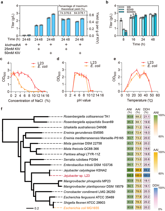 本研究从超级蠕虫Zophobas atratus肠道中分离出一株耐盐肠道微生物,并鉴定该菌株为济州杆菌Jejubacter sp. L23。L23菌株为革兰氏阴性菌,细胞呈杆状,兼性厌氧,能够在0~12%(w/v)NaCl,10~45℃,以及pH4.0~10.0的条件下生长。并且与大肠杆菌具有高度的生理生化及遗传相似性。通过对该菌株进行系统研究,开发了一系列代谢工程改造相关的基因元件、遗传操作方法和基因编辑工具等。以α-酮异戊酸为底物,L23菌株在低盐灭菌、高盐灭菌以及非灭菌的条件下均可高效生产异丁醇。初步证明了济州杆菌非灭菌发酵生产异丁醇的可能性(图2)。