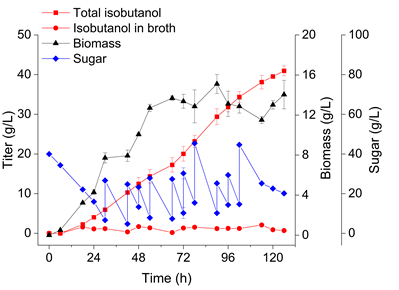 图4 在3 L发酵罐中以菊粉为底物非灭菌发酵生产异丁醇