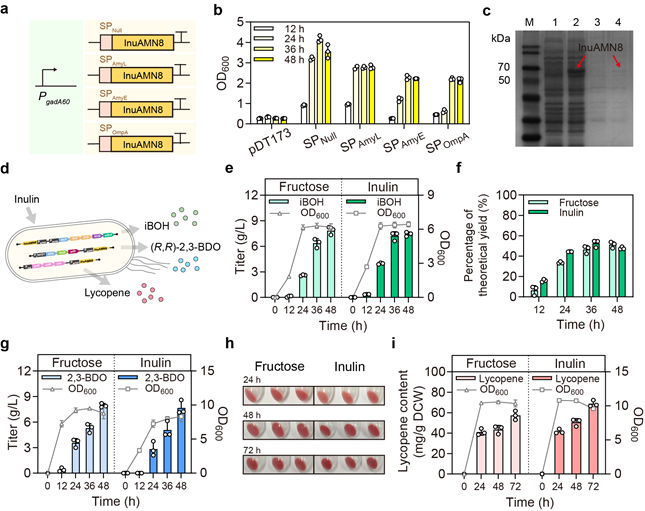 对微生物基因组的改造可以调整菌株的代谢网络,减少竞争代谢途径的影响,使菌株更高效地合成目标产物。因此,通过分析济州杆菌的代谢网络,并利用CRISPR/Cas9基因编辑系统,对L23菌株基因组进行了快速且高效的改造,以获得工程改造菌株L23R7。进一步通过分泌表达外切菊粉酶InuAMN8,实现了L23R7菌株以菊粉为底物分别生产7.4±0.2g/L异丁醇、7.7±0.8g/L ( R , R )-2,3-丁二醇或68.8±3.1mg番茄红素/gDCW。证明了济州杆菌作为NGIB新平台宿主,以非粮生物质菊粉为底物,非灭菌发酵生产多种高附加值化合物的潜力(图3)。