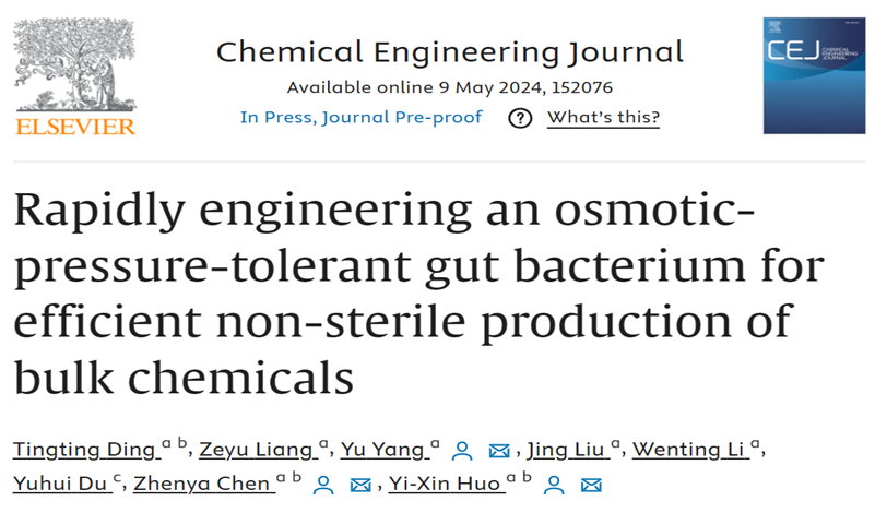近日,北京理工大学霍毅欣教授团队在改造耐盐济州杆菌实现非灭菌发酵生产方面取得重要进展。相关研究成果以“Rapidly engineering an osmotic-pressure-tolerant gut bacterium for efficient non-sterile production of bulk chemicals”为题,在顶级期刊《Chemical Engineering Journal》(影响因子:15.1)上发表(doi.org/10.1016/j.cej.2024.152076)。