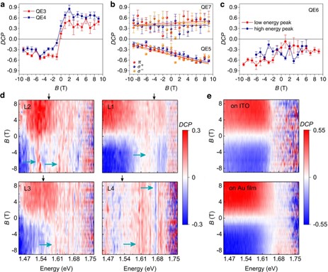 图3.手性等离激元晶格L1处QEs的圆偏振分辨的磁光光谱(磁场方向垂直于样品表面)。