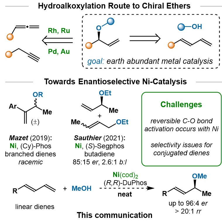 醚(C-O)键广泛存在于药物、农用化学品和功能材料中,其高效构筑吸引了研究者越来越多的关注。通常C-O键是通过Rh、Ru、Pd或Au等贵金属催化的炔烃或联烯的氢烷氧基化反应来构筑(图1)。通过廉价易得的丰产金属(例如Ni)催化1,3-二烯的氢烷氧基化来构建C-O键,最近引起化学家们的兴趣。然而Ni催化1,3-二烯的氢烷氧化反应目前主要面临两个挑战:1) Ni通常会可逆地活化C-O键,导致产物消旋化;2) 反应的区域选择性问题。为了解决这些挑战,近日北京理工大学杨小会课题组首次报道了无溶剂条件下Ni催化1,3-二烯的不对称氢烷氧化反应,能以高对映选择性和区域选择性地构筑C-O键(图1)。