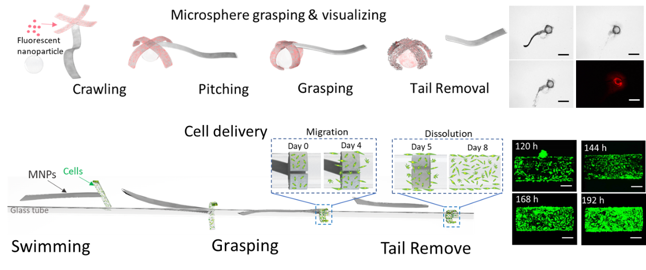 通过模块化软体微机器人制造方法,团队设计了经典的条状微机器人本体结构,并为其不同模块区域搭载了磁性纳米颗粒、造影剂(如微泡和荧光纳米颗粒)、功能性细胞、靶向药物等不同物质,使其能够兼具磁驱动、封闭空间显影反馈、靶向作业等性能。通过赋予微机器人本体不同模块特定的形变模式,使其能够感知生物活体环境中变化的体液离子浓度与pH值,发生局部区域同轴、异轴形变并通过磁驱动模仿毛虫蠕动、鱼类摆尾,实现运输、投递、移植、回收、降解等多序列复杂任务,有望在未来个性化靶向医疗中大展拳脚。