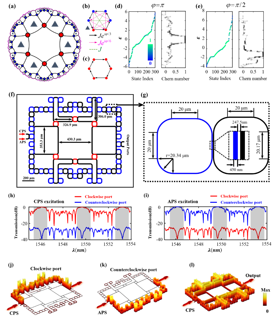 首先,研究人员考虑了庞加莱圆盘上的{6,4}面心双曲拓扑晶格模型,如图1a-1c所示。通过引入最近邻、次近邻和次次近邻格点间的复数耦合(一半原包内),可以破坏系统的时间反演对称性,从而引入非平庸的拓扑性质。图1d和1e分别显示了两种耦合相位下的能谱和实空间陈数计算结果,其中能谱格点的颜色表征相应特征态的边缘局域化强度。可以看出,在零能附近存在具有非平庸陈数的双曲边界态。随后,研究人员通过设计环形谐振腔的空间排布和耦合,理论构造了对应于{6,4}双曲拓扑晶格模型的片上光学结构,如图1f所示。图1g为双曲拓扑光学结构的局部放大示意图。进一步,研究人员利用有限元方法,对所设计的双曲拓扑光学结构进行全波模拟。图1h和1i分别显示了顺时针赝自旋(CPS)和逆时针赝自旋(APS)激发下,对应于相反传播方向输出端口的透射谱计算结果。计算结果显示,在拓扑边界态的频率范围内,CPS和 APS分别在相反传播方向的出射端口展现高透射率。而在平庸边界态和体态对应的频率范围内,展现较低透射率。图1j和1k显示了拓扑频率激发下CPS和 APS的稳态场分布结果。图1l为平庸体态频率激发的场分布结果。计算结果表明,在拓扑态频率范围激发下,输入光信号可以展现赝自旋选择特性的拓扑边缘传导特性。
