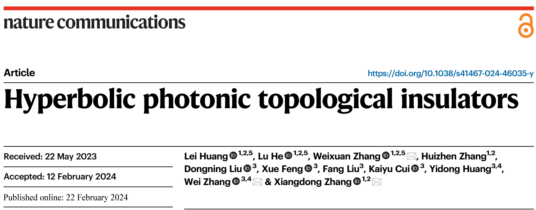 日前,北京理工大学物理学院张向东教授课题组与清华大学电子工程系黄翊东教授课题组合作,在双曲光拓扑绝缘体研究方面取得重要进展。相关工作发表在Nat. Commun.  15, 1647 (2024)上。研究工作得到国家重点研发计划,国家自然科学基金和中国科协青年人才托举工程的资助。北京理工大学物理学院博士生黄磊、何路(现为光电学院特立博士后)和张蔚暄副教授为论文共同第一作者,张向东教授、清华大学张巍教授和张蔚暄副教授为通讯作者。另外,北京理工大学张慧珍副研究员,清华大学刘仿教授、冯雪副教授、崔开宇副教授、刘东宁博士也对此工作做出了贡献。