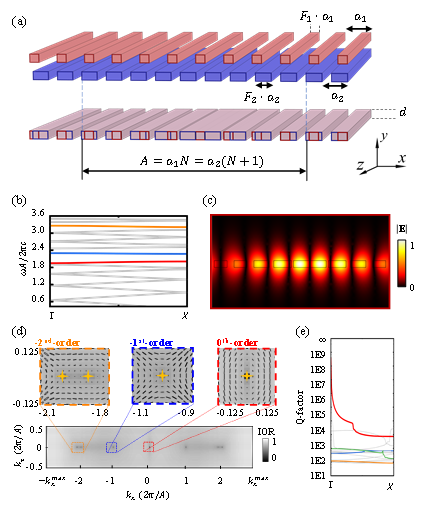 针对上述问题,研究人员利用两层周期失配的一维光子晶体光栅,通过上下层的融合构建了moiré光栅结构,如图1a所示。其能带分布展示于图1b,可以看到多条色散性较弱的光子平带。对于图中红色能带,其在Γ点的本征场分布如图1c所示,清晰展现出moiré平带的本征场具有明显的局域化特性。相比于传统的亚波长光栅能带结构,moiré光栅的每个布洛赫模式都存在多个辐射通道。因此,单一的拓扑荷不足以实现完美的moiré BIC。为此,在moiré平带中实现BIC的关键在于将多个拓扑荷调节到所有辐射通道处。