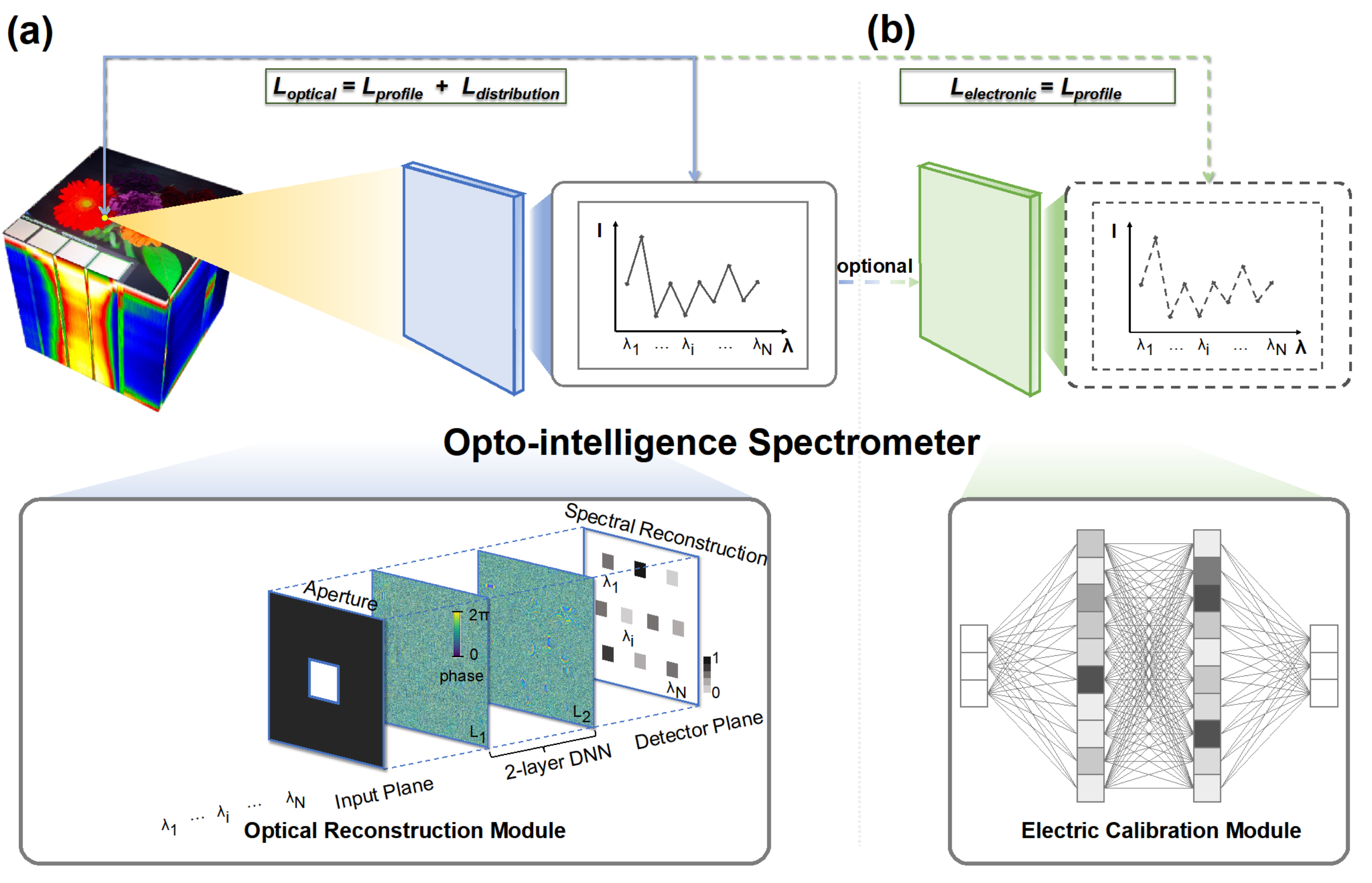 近日,北京理工大学光电学院许廷发教授科研团队与清华大学林星助理教授团队联合开发了一种新型全光学智能光谱仪(Opto-Intelligence Spectrometer, OIS)。该设备基于衍射神经网络技术,实现了空间相干或空间非相干光源下的精准光谱重构,并具有低能耗和光速处理的显著优势。相关成果已以“Opto-intelligence Spectrometer Using Diffractive Neural Networks”为题发表在国际顶尖光学期刊《Nanophotonics》上(中科大类1区,Top期刊)。《Nanophotonics》由德国Walter de Gruyter出版社发行,聚焦于探索光与物质的相互作用及其基本原理和应用等前沿进展。该论文的第一作者为北京理工大学硕士研究生王泽和清华大学博士后陈航,通讯作者为李佳男副研究员、许廷发教授和林星助理教授。