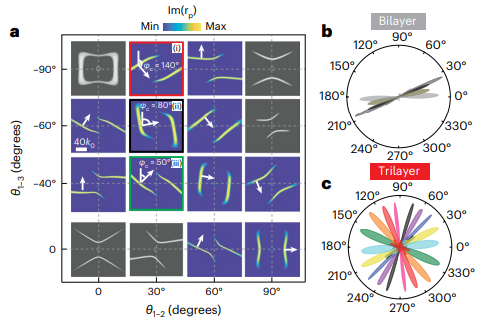 通过构建多层转角结构普适的理论模型,研究人员发现三层转角氧化钼晶体中极化激元无衍射传播方向强烈依赖于转角。如图2所示,当转角(θ1-2为第一层和第二层氧化钼晶体之间的转角,θ1-3为第一层和第三层氧化钼晶体之间的转角)发生改变时等频线法线方向也在发生变化(例如θ1-2 ="30°," θ1-3 =""-40°时法线与竖直方向夹角为φc=50°,而θ1-2 =30°, θ1-3 =""-60°时φc=80°),即可以通过改变三层氧化钼晶体转角实现纳米红外光场低损耗、无衍射传播的面内全角度调控。可以看到,在双层转角氧化钼晶体中通过改变材料层厚、入射光频率等多个参数仅能在0-30°的范围内实现纳米光场无衍射传播方向的调控。然而,三层转角氧化钼晶体中通过改变转角(相同的三层氧化钼晶体,不改变材料层厚)可以实现纳米红外光场无衍射传播方向的面内全角度(0-360°)调控。