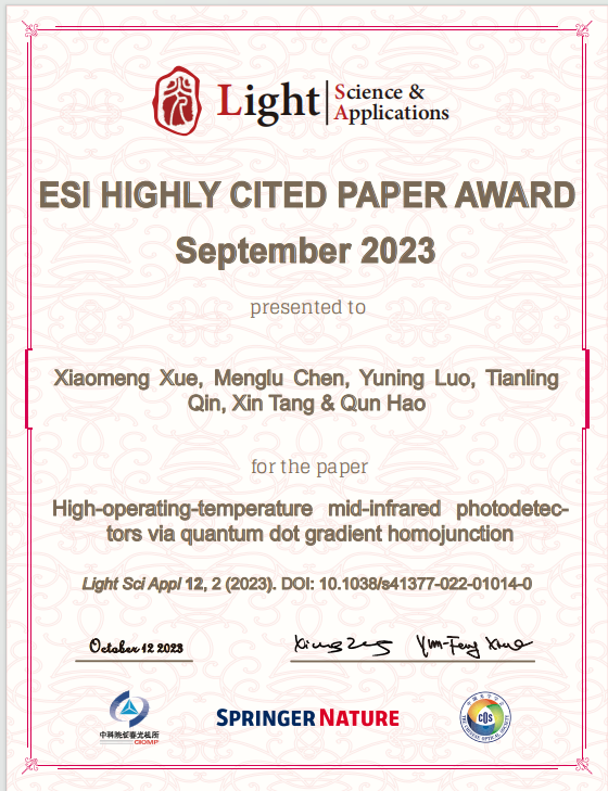 北京理工大学郝群教授团队在室温运行中波红外探测器研究方面取得突破性的进展,相关论文于2023年1月发表于光学顶刊Light:Science & Applications,获得封面论文。近日该论文入选ESI高被引。